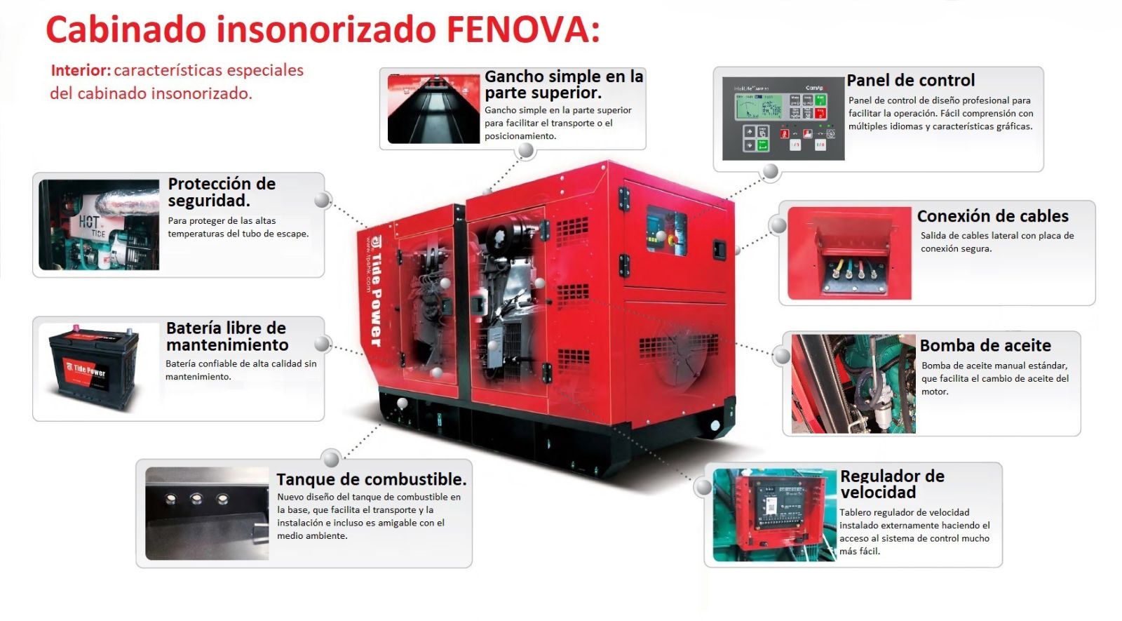 Motor industrial con sistema de refrigeración, sistema de inyección, regulador de velocidad automática, sistema de encendido eléctrico, alternador cargador de batería, sensor de presión de aceite, sensor de alta temperatura de motor.